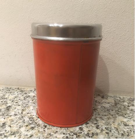 Blik met grote overhangende deksel, zie voorbeeld foto.