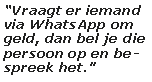 De schaduwzijde van ons online gedrag is bijvoorbeeld fraude via WhatsApp. De inmiddels bekende methode om via WhatsApp om geld te vragen, waarbij de dader zich voordoet als een familielid komt nog steeds veel voor. Hoe verschrikkelijk is het dat je denkt je zoon te helpen, maar er ondertussen een gewetenloze crimineel met jouw geld vandoor gaat. Trap er niet in! Vraagt er iemand via WhatsApp om geld, dan bel je die persoon op en bespreek het. Klik niet op bijgevoegde linkjes en maak niet zomaar geld over. Ben voorzichtig!