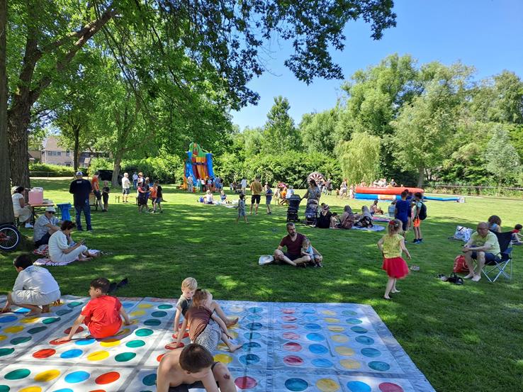 Iedereen was welkom om samen te spelen en met een kleedje plaats te nemen op het veld. Voor de volwassenen een mooi moment om bij te kletsen en van de zon te genieten, terwijl de kinderen konden spelen op de diverse attracties.